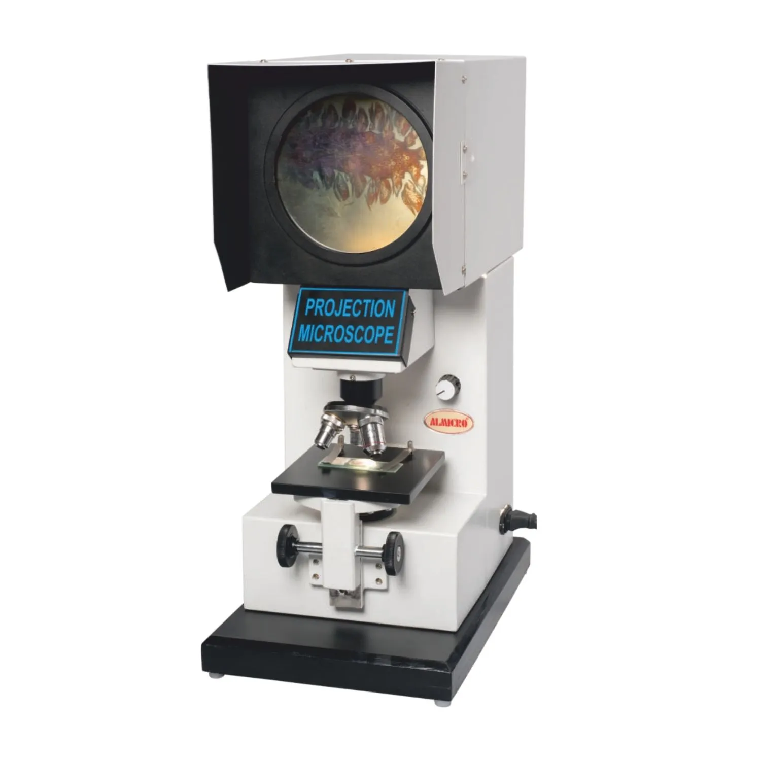 Having 12 volts 100 Watts Halogen projection bulb workable on 220volts AC mains with triple revolving nose priece, 160mm dia, built in screen along with wall screen attachment giving magnification 40xto 400x, complete with the following:
